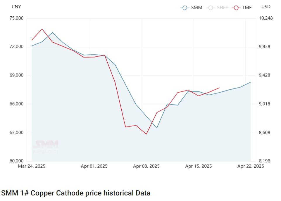 در بورس فلزات شانگهای قیمت مس در این هفته به دلیل کاهش ارزش دلار روند افزایشی داشت و با 132 دلار افزایش نسبت به هفته گذشته در 22 آپریل به 9,334 دلار رسید. با کاهش محموله های ورودی و خرید صنایع پایین دستی موجودی انبار مس کاهش یافت. پس از اینکه قیمت مس در بازار آتی افزایش یافت، برخی از خریداران پایین دستی به دلیل نگرانی از افزایش مستمر قیمت، برای خرید عجله نشان دادند اما سعی کردند پریمیوم و تخفیف معاملات spot را کاهش دهند. با این حال، عرضه کنندگان تمایلی به کاهش قیمت نشان ندادند و روند صعودی را حفظ کردند.