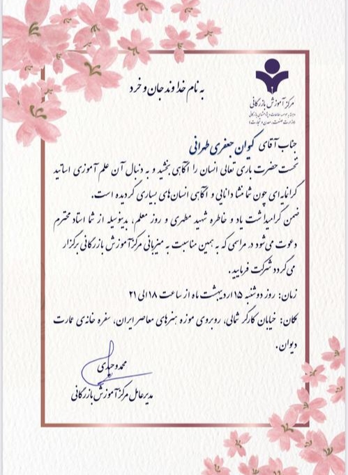 دعوت مرکز آموزش بازرگانی از کیوان جعفری طهرانی برای حضور در مراسم گرامیداشت یاد و خاطره شهید مطهری و روز معلم