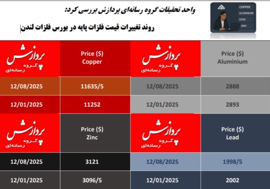 گروه رسانهای پردازش- دکتر کیوان جعفریطهرانی، تحلیلگر ارشد بازارهای بینالمللی در ارزیابی تازه خود از وضعیت چهار فلز پایه مس، آلومینیوم، روی و سرب، خاطرنشان کرد: در حالی که اختلال در تامین برخی فلزات از قیمتها حمایت میکند، حساسیت معاملهگران نسبت به تصمیمات آتی فدرال رزرو، فضای معاملات کوتاهمدت را محتاط کرده است.
